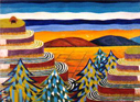 brilliant reds, oranges, yellows and blues, are characterized as semi abstract